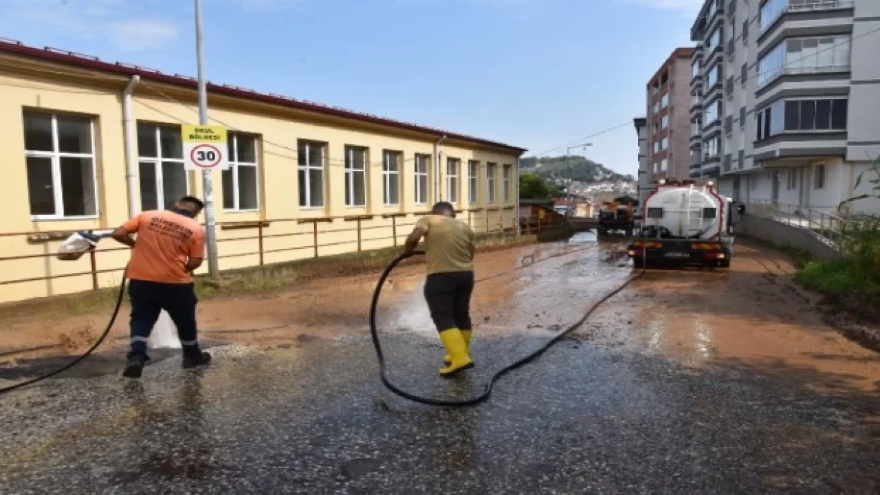 Metrekareye 132 kilogram yağışın düştüğü bölgeden hiç ayrılmayan belediye ekipleri tarafından geniş kapsamlı çalışmalar yürütülüyor.
