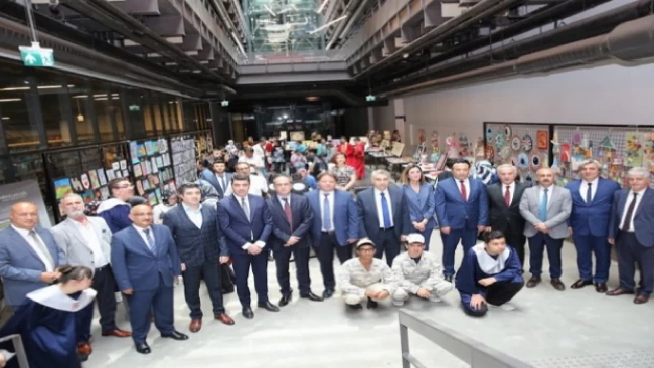 Daha sonra Hacı Mustafa Postaağası Özel Eğitim Meslek Okulu öğrencilerinin yıl boyunca yaptıkları eserleri konferans salonunu önündeki fuaye alanında açılan yıl sonu sergisinde sergilendi.