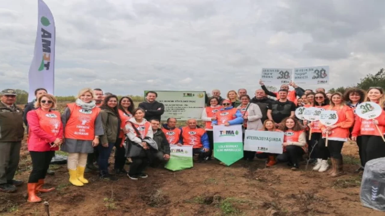 TEMA Vakfı’nın 30’uncu yıl gecesinin sunuculuğunu gönüllü olarak üstlenen Seda Öğretir ve Yiğit Özşener’in de katılımıyla, 7 hatıra ormanından biri olan ve Kırklareli ili Lüleburgaz ilçesi, Celaliye köyü sınırları içerisinde yer alan ormana ziyaret gerçekleştirildi. Etkinliğe İstanbul Orman Bölge Müdürlüğü Ağaçlandırma Şube Müdürü Talip Kavlak ve Kırklareli Orman İşletme Müdürü İsmail Karakaya, TEMA Vakfı Yönetim Kurulu Başkanı Deniz Ataç, Genel Müdürü Başak Yalvaç Özçağdaş ile Vakıf gönüllüleri ve Genel Merkez çalışanları katıldı. Tabela açılışının ardından fidan dikim etkinliğine geçildi ve temsili fidanlar toprakla buluşturuldu.