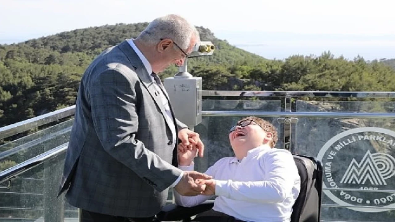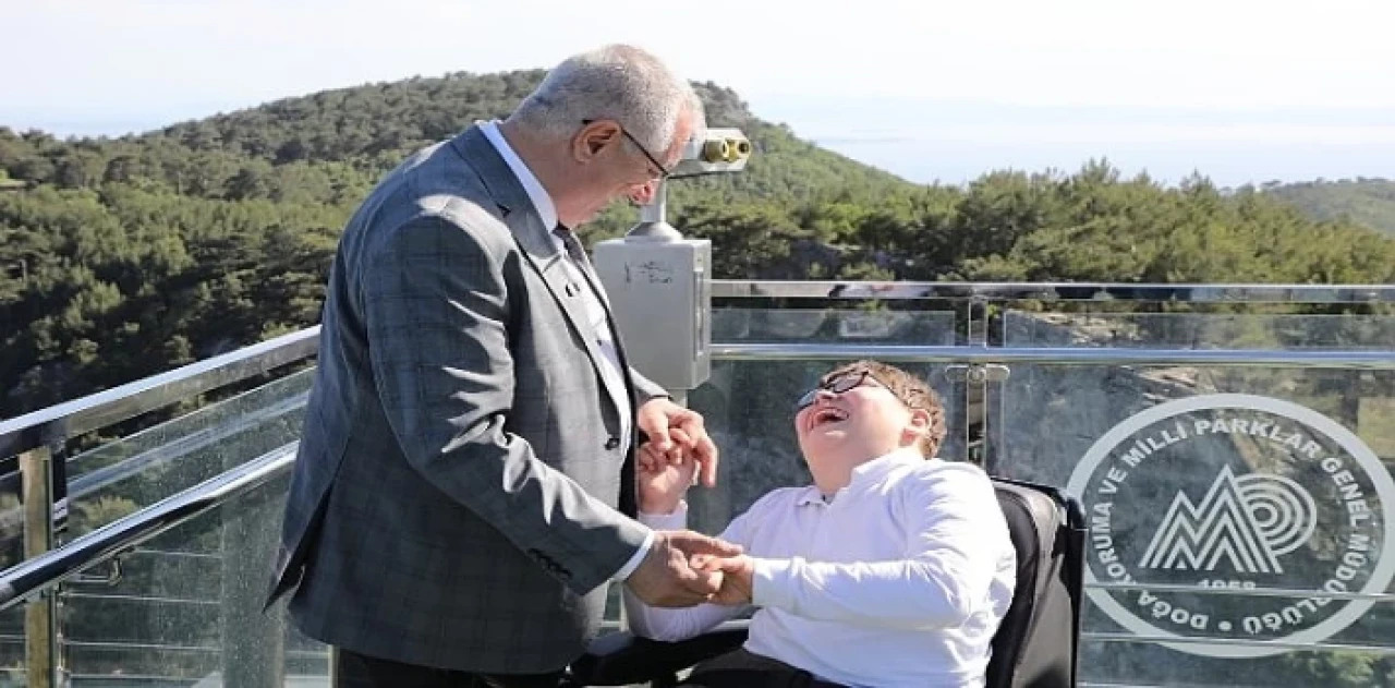 Kazdağları Milli Parkı sınırları içerisinde bulunan Cam Seyir Terasına götürülen Hayran’ın mutluluğu gözlerinden okundu. Belediye Başkanı Mehmet Ertaş'ın yakın ilgi gösterdiği engelli Muhammet Hayran, başkan sık sık sarılarak sevgi gösterisinde bulundu.