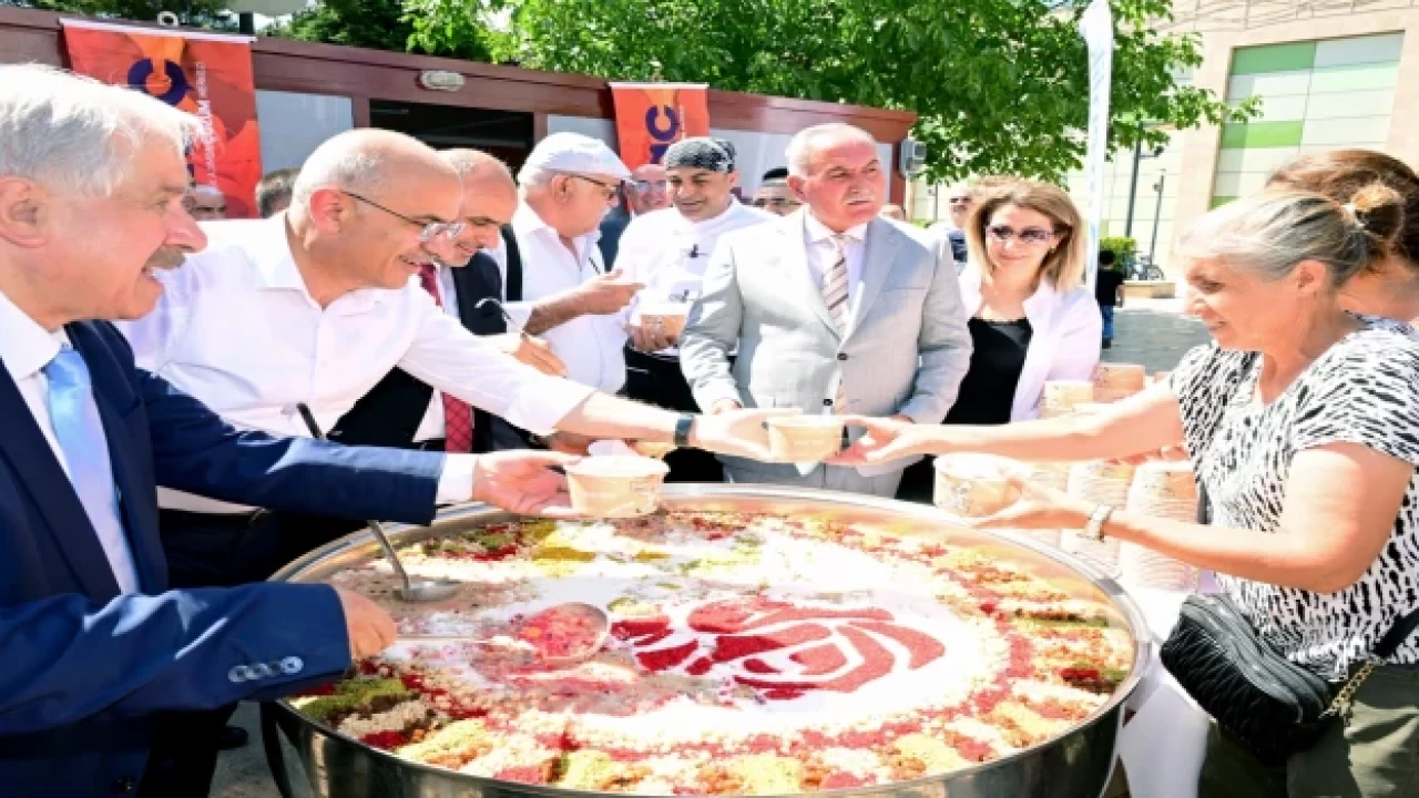 Aşure dağıtımı öncesinde Malatya İl Müftüsü Ramazan Dolu, birlik, beraberlik ve kardeşlik mesajları vererek, dualar etti.
