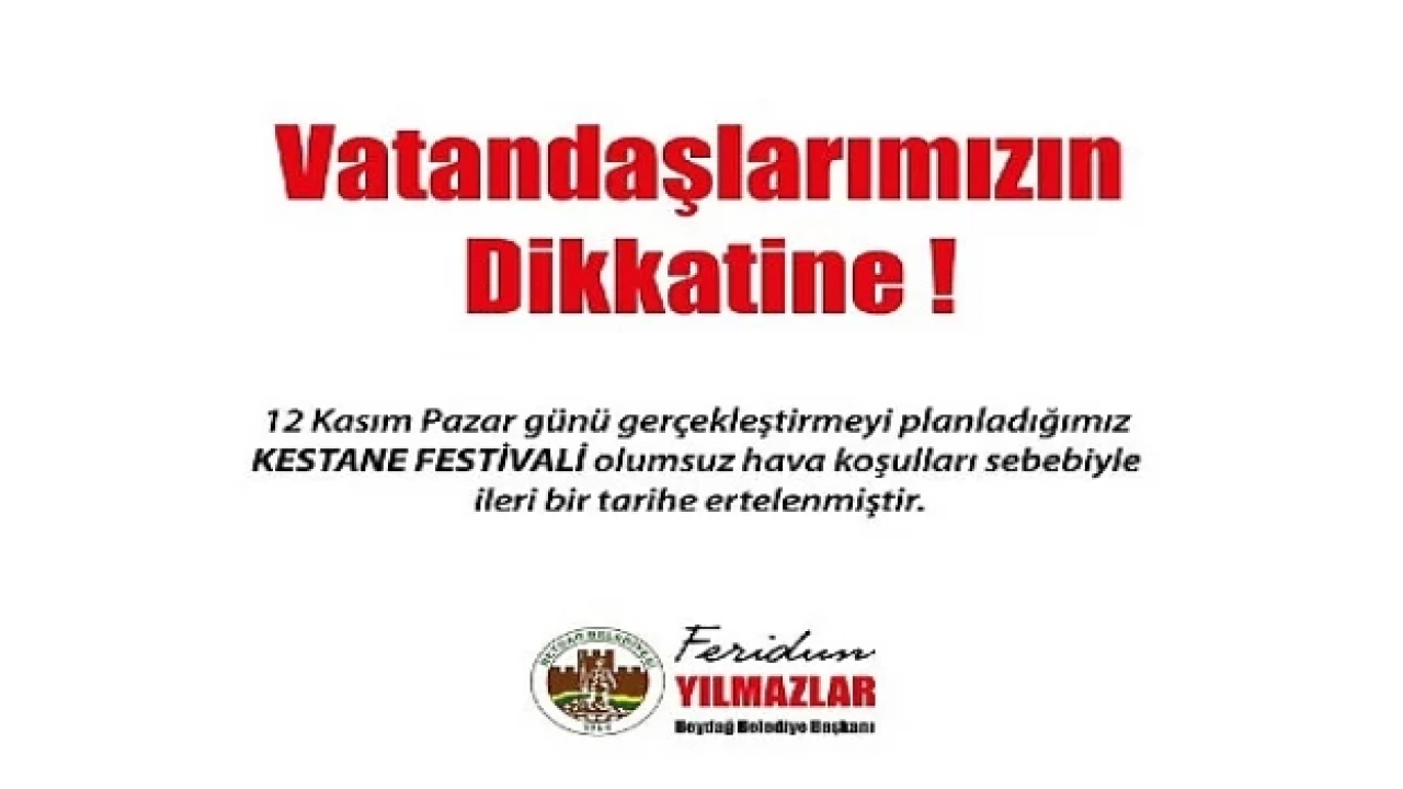 Başkan Yılmazlar, " 12 Kasım Pazar günü gerçekleştirmeyi planladığımız Kestane Festivali olumsuz hava koşulları sebebiyle ileri bir tarihe ertelenmiştir. Festival tarihini sosyal medya hesaplarımızdan duyuracak olup hep birlikte ileri bir tarihte festivalimizi gerçekleştireceğiz. Vatandaşlarımıza duyurulur.” dedi.