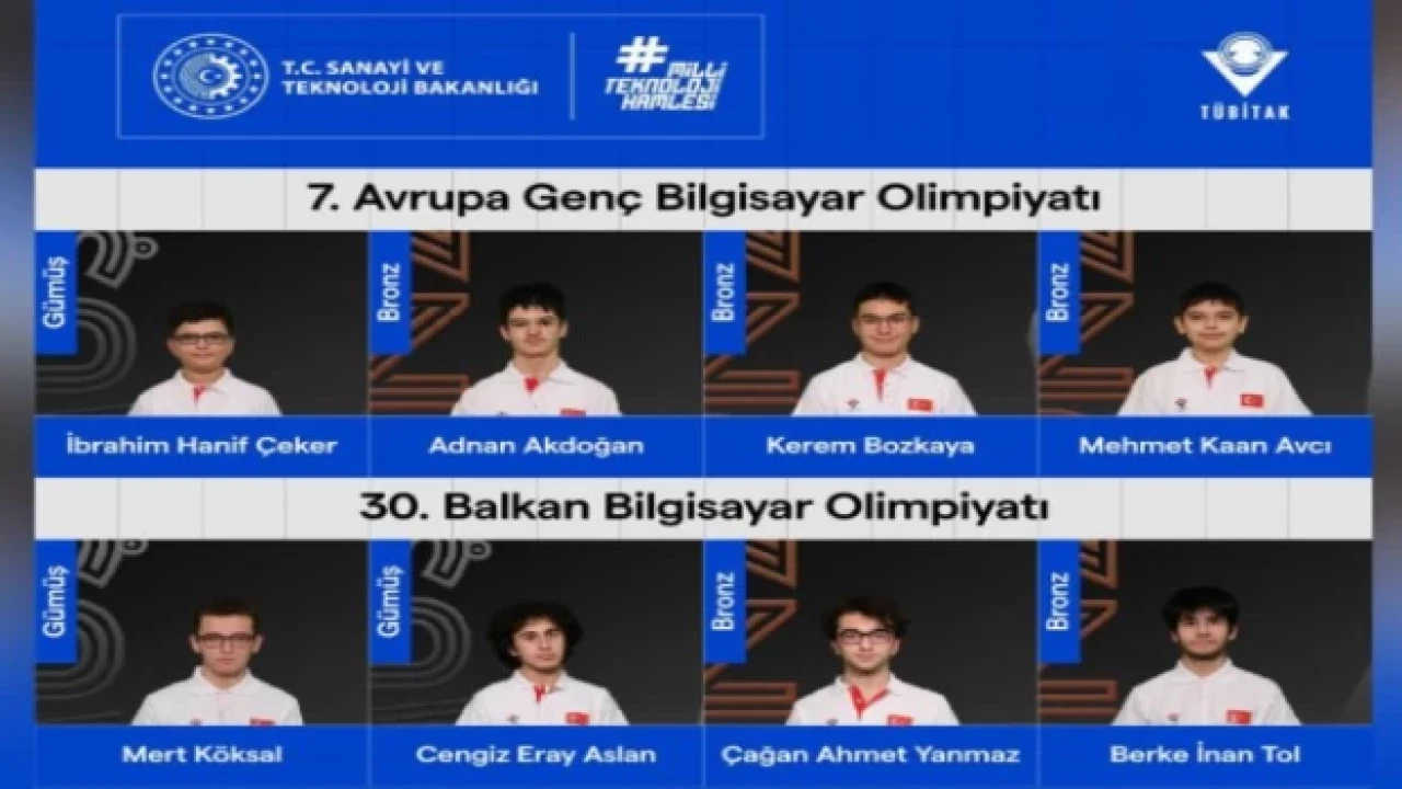 TÜBİTAK BİDEB bünyesinde yürütülen 2202 Bilim Olimpiyatları kapsamında Türkiye’yi uluslararası arenada temsil etmek üzere yetiştirilen genç bilim insanlarının katıldıkları tüm yarışmalarda başarılarıyla bayrağımızı gururla dalgalandırdığını kaydeden Bakan Kacır, bakanlığın resmi internet sitesinde yaptığı açıklamada, “Bu kapsamda 4 öğrencimizin katıldığı 30’uncusu düzenlenen Balkan Bilgisayar Olimpiyatı’nda milli takımımız 2 Gümüş ve 2 Bronz madalya kazandı. Ülkemizi temsil eden öğrencilerimizden; Mert Köksal ve Cengiz Eray Aslan Gümüş madalya, Berke İnan Tol ve Çağan Ahmet Yanmaz bronz madalya kazandı" dedi.