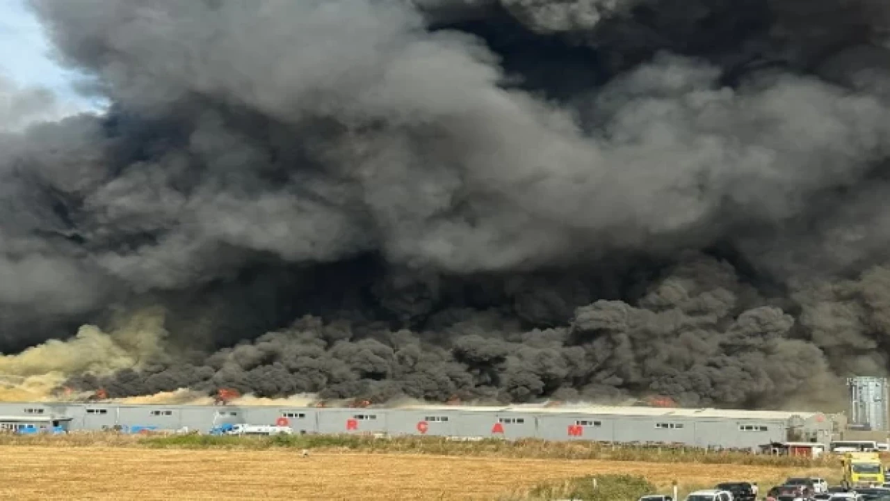 Yangının halen etkili olduğu bölgede, çevre fabrikaları tamamen tahliye edilirken oluşan yoğun duman yaklaşık 40 kilometre öteden dahi görülüyor.