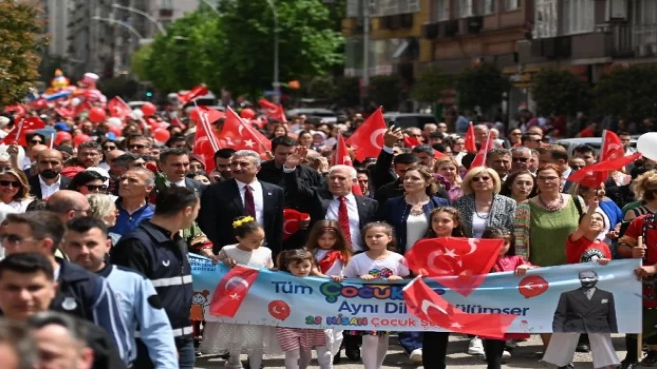 23 Nisan coşkusu, yüzlerce çocuk ve ailelerinin katılımıyla Altıparmak Caddesi’nden Merinos Parkı’na doğru yapılan kortej yürüyüşüyle başladı. Ellerindeki Türk bayraklarıyla marşlar söyleyerek ve şiirler okuyarak yürüyen çocuklara, Büyükşehir Belediye Başkanı Mustafa Bozbey ve eşi Seden Bozbey, CHP İl Başkanı Nihat Yeşiltaş ve Bursa Milletvekili Orhan Sarıbal da eşlik etti.