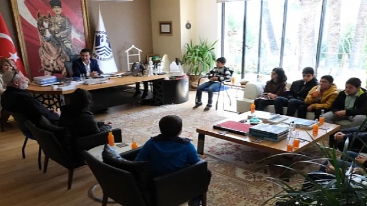Kent Konseyi Çocuk Meclisi üyesi Bodrumlu çocuklar, Bodrum Belediye Başkanı Ahmet Aras’ı makamında ziyaret ederek çalışmaları hakkında bilgiler verdi.