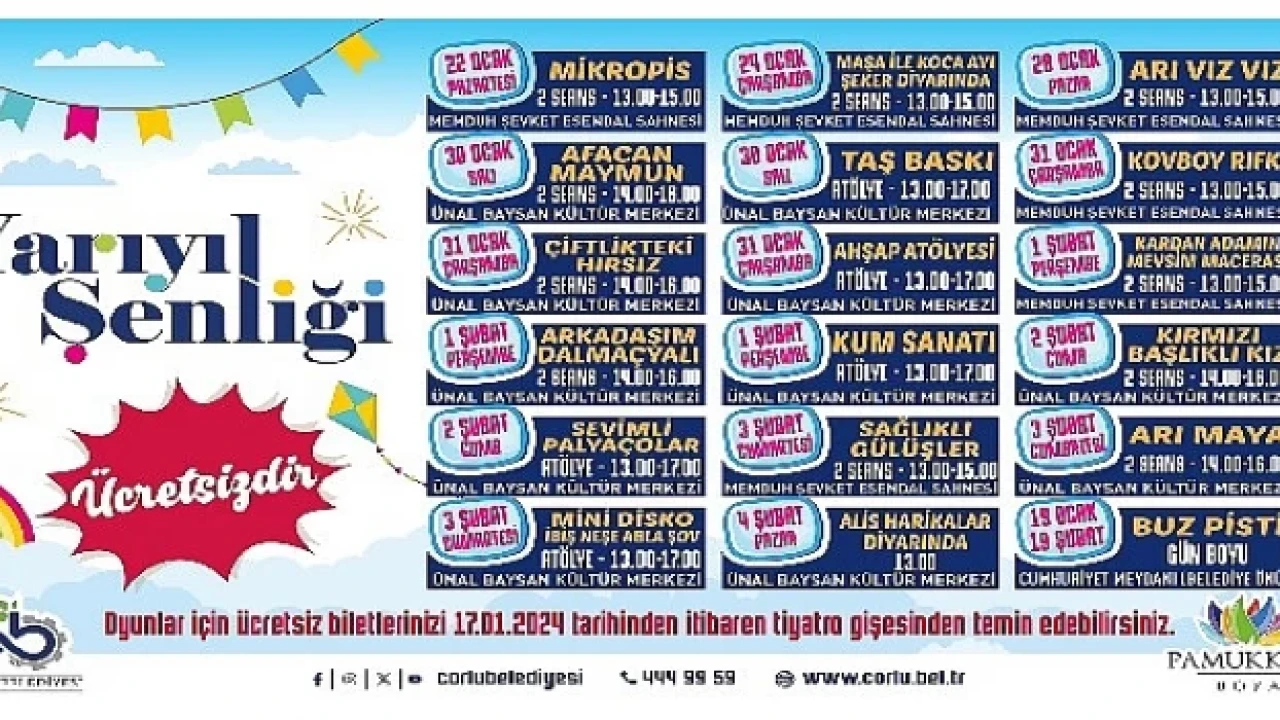 Çorlu Belediyesi "Yarıyıl Şenliği" 19 Ocak 2024 Cuma günü gerçekleştirilecek olan buz pisti açılışıyla başlıyor. Buz pisti, 19 Ocak 2024 – 19 Şubat 2024 tarihleri arasında açık kalacak. Hafta içi 10 - 20.00, hafta sonları ise 10 – 21 saatleri arasında Cumhuriyet Meydanı, belediye hizmet binası önünde açık olarak hizmet verecek. Tiyatro Oyunları ve Atölye Çalışmaları Ücretsiz