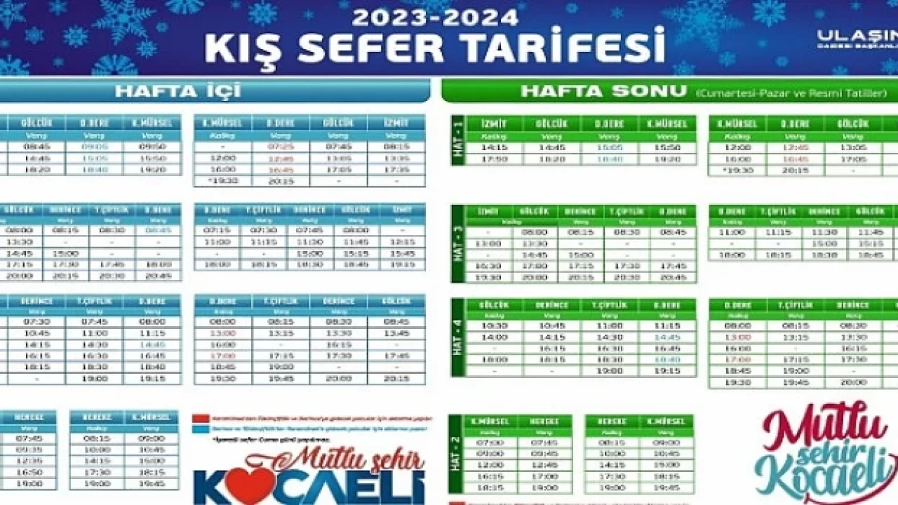 Kocaeli Büyükşehir Belediyesi, Deniz ulaşımında kış sefer tarifesi uygulamasına 11 Eylül Pazartesi günü itibariyle başlıyor. Buna göre Hat 1 İzmit-Gölcük-Değirmendere-Karamürsel, Hat 2 Karamürsel-Hereke, Hat 3 İzmit-Gölcük-Derince-Tütünçiftlik-Değirmendere, Hat 4 ise Gölcük-Derince-Tütünçiftlik-Değirmendere güzergâhı arasında gidiş dönüş olarak 11 Eylül Pazartesi gününden itibaren kış tarifesine geçecek. Deniz ulaşımında kış sefer tarifesi Büyükşehir’in kocaeli.bel.tr internet sitesinde bulunan “Vapur Saatleri” linkinden takip edilebilir.