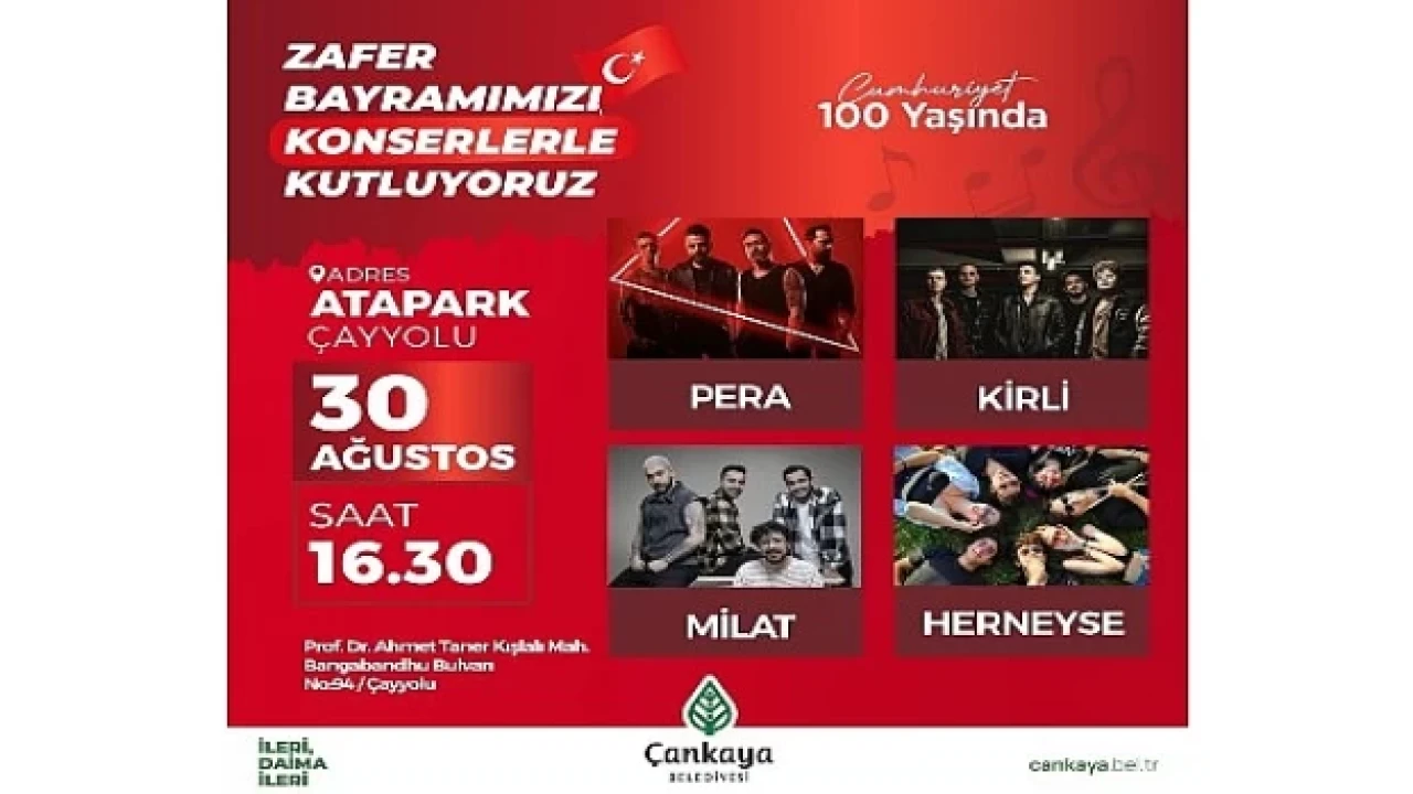 Zafer Bayramı'nın 101. yılında Çankaya'da kutlamaların ana adresi Çayyolu'ndaki Atapark olacak. 4 konserle taçlanacak kutlamalarda 'Her Neyse' 'Milat' 'Kirli' ve 'Pera' grupları sahne alacak.
