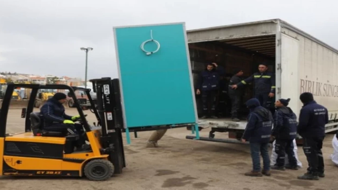 Deprem felaketi sonrası bölgede en acil ihtiyaçlardan olan tuvalet konusunda Eskişehir Büyükşehir Belediyesi atölyelerinde üretilen seyyar tuvaletler Hatay, Gaziantep ve Malatya başta olmak üzere afetten zarar gören illere ulaşmaya devam ediyor.