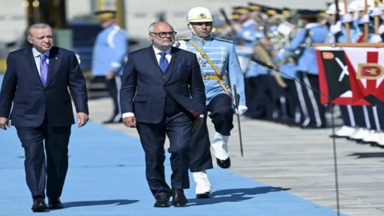 Cumhurbaşkanı Erdoğan, Karis'i külliyenin ana giriş kapısında karşıladı. İki liderin tören alanındaki yerlerini almasının ardından 21 pare top atışı eşliğinde millî marşlar çalındı.