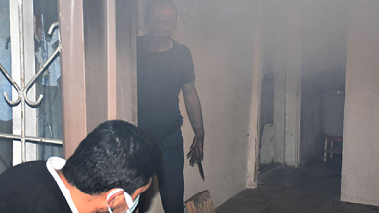 DHA'nın haberine göre, yaklaşık yarım saat süren çabanın ardından M.T., elindeki bıçağı bırakarak dışarıya çıktı. Yangın ise itfaiyenin çabasıyla büyümeden söndürüldü.