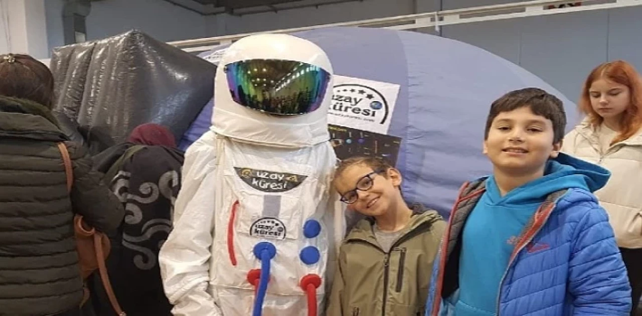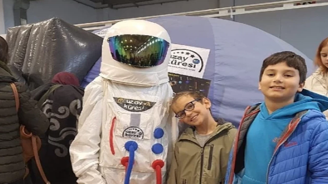 Astronot kıyafetli öğreticilerin karşıladığı çocuklar, Uzay Küresinin içinde yansıtılan gezegenlerin, yıldızların ve diğer gök cisimlerinin görüntülerini büyük hayranlıkla izledi.