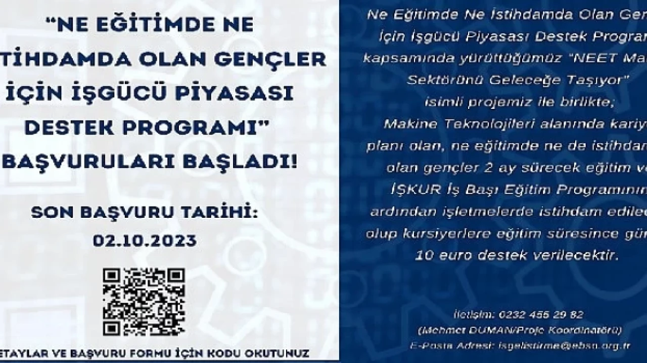 Ege Bölgesi Sanayi Odası(EBSO) tarafından İstihdam, Eğitim veya Öğretimde Olmayan Gençler İçin İşgücü Piyasası Destekleme Programı’na (NEETs) başvurusu yapılan “NEET Makine Sektörünü Geleceğe Taşıyor” isimli AB projesine başvurular başladı. Eğitim ve istihdam dışındaki gençlerin işgününe katılması amacıyla gerçekleştirilen projede Gençler 2 aylık eğitim süreci boyunca hem makine teknolojileri alanında eğitim; hem de günlük 10 Euro destek alacak.