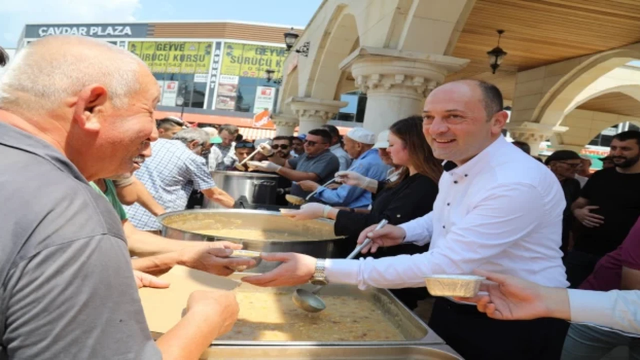 SAKARYA (İGFA) - Paylaşmanın, dayanışmanın ve birlikteliğin ifadesi olan Aşure Günü dolayısıyla Geyve Belediyesi özel bir etkinlik düzenledi. Cuma namazı sonrasında Geyve Merkez Sinan Bey Camii önünde binlerce vatandaş ile birlikte gerçekleştirilen etkinlikte Geyve Belediye Başkanı Selçuk Yıldız kazanın başına geçerek tek tek aşure dağıttı.