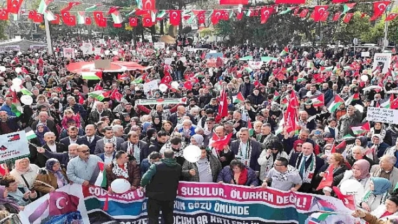 bir araya gelen binlerce kişi ve STK temsilcileri, Filistin’deki katliama tepki göstermek için Kavaklı