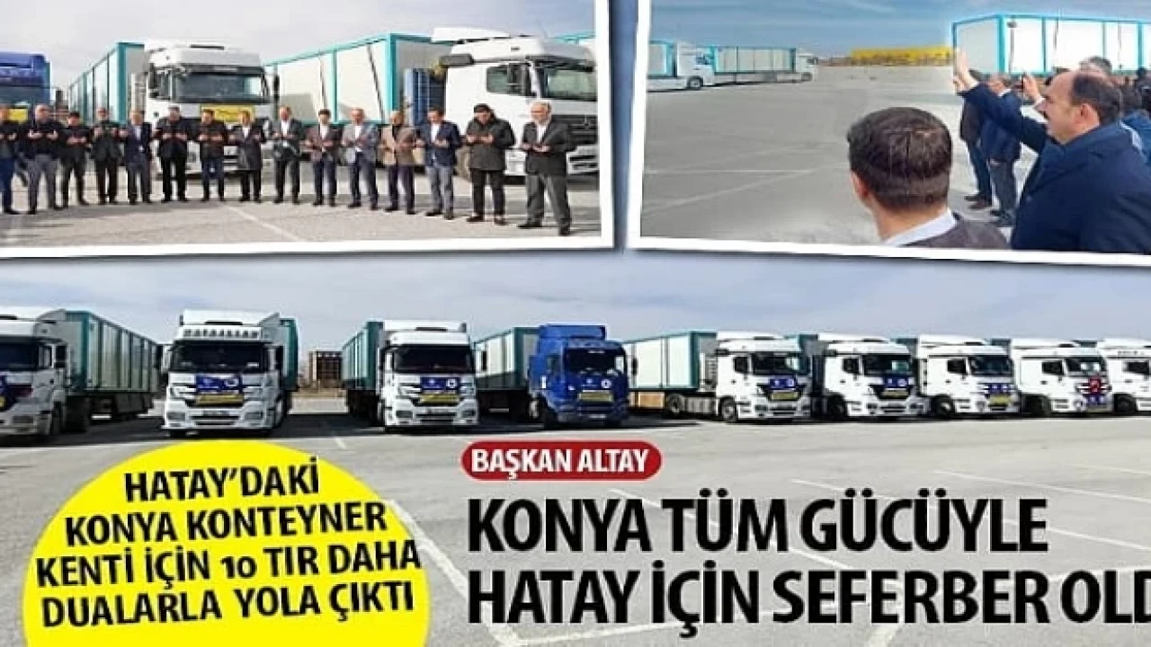 Konya Büyükşehir Belediyesi, Konya Ticaret Odası, Konya Sanayi Odası, Konya Ticaret Borsası ile Selçuklu, Meram ve Karatay belediyelerinin Hatay’da kuracağı Konya Konteyner Kenti için 10 TIR ile 20 konteyner daha dualarla Konya’dan yola çıktı.