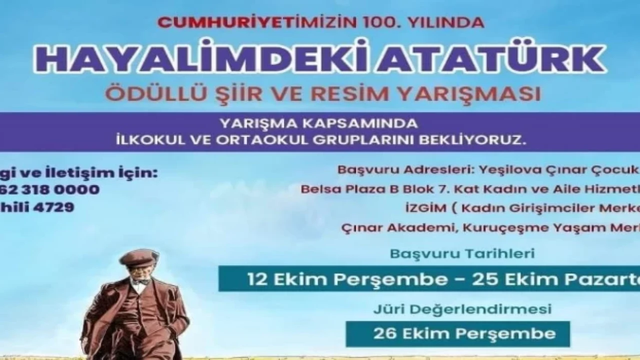 Kocaeli İzmit Belediyesi'nin Cumhuriyetimizin kuruluşunun 100’üncü yıl dönümü kapsamında çocuklar için düzenlediği, ’Hayalimdeki Atatürk’ temalı şiir ve resim yarışması için başvurular 25 Ekim’e kadar devam edecek