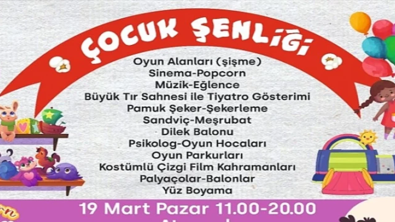 Şişme oyun alanları, tiyatro gösterileri, sinema gösterimi, palyaço, çizgi film figüranları, yüz boyama gibi etkinliklerle çocukların gününe renk katacak şenlikte çocuklara balonlar dağıtılıp pamuk şeker, patlamış mısır ve yiyecek ikramında bulunulacak.