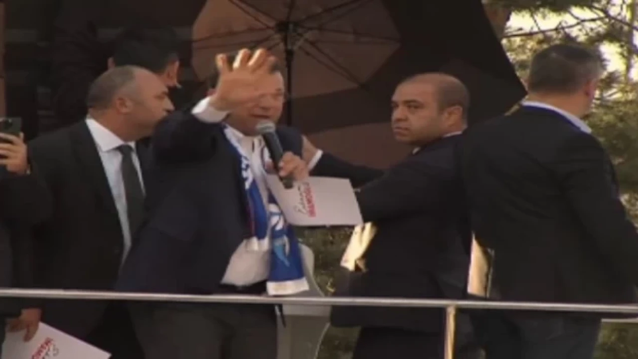 Miting alanının hemen yanında toplanan bir grup İmamoğlu’nun bulunduğu otobüse ve alandaki vatandaşlara taş ve yanlarında getirdikleri bazı cisimleri fırlatmaya başladı. Saldırı sonrası bazı vatandaşlar yaralandı.