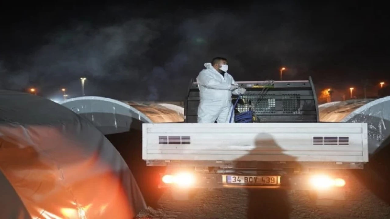 Beylikdüzü Belediyesi’nin Hatay İskenderun’da 70 dönümlük bir alanda kurduğu çadır kentte olası salgın hastalıklara karşı ilaçlama ve dezenfeksiyon çalışmaları başladı. Veteriner İşleri Müdürlüğü ekiplerince ortak kullanım alanları, tuvalet, duş ve çadırlar başta olmak üzere tüm alan ilaçlanarak dezenfekte ediliyor.