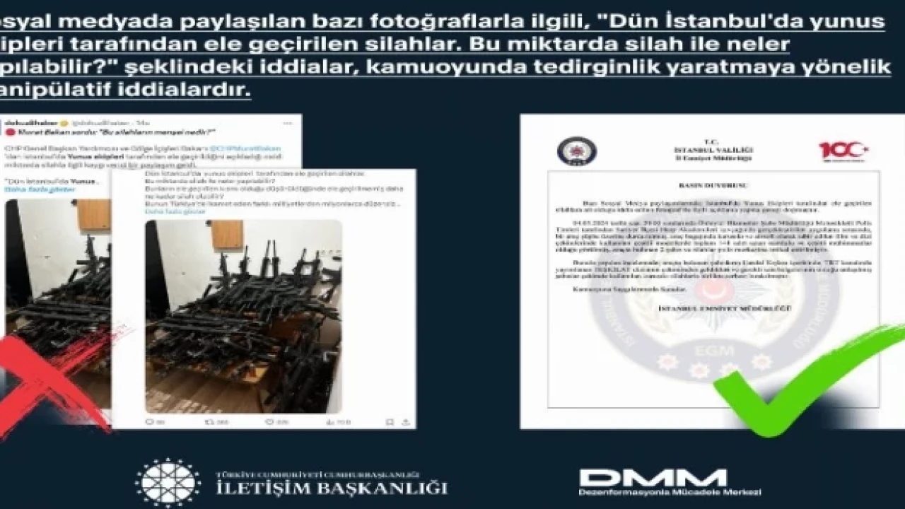 Sosyal medyada paylaşılan bazı fotoğraflarla ilgili, "Dün İstanbul'da yunus ekipleri tarafından ele geçirilen silahlar. Bu miktarda silah ile neler yapılabilir?" şeklindeki iddialar, kamuoyunda tedirginlik yaratmaya yönelik iddiaların manipülatif olduğu kaydedildi.