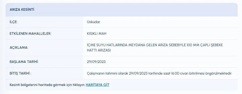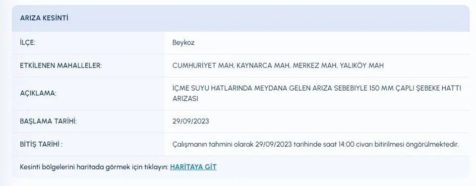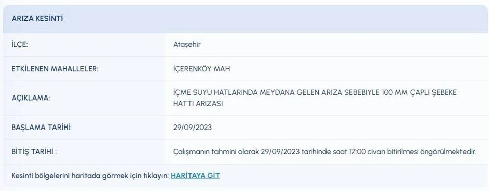 İSKİ (İstanbul Su ve Kanalizasyon İdaresi) planlı su kesintisi programını paylaştı. 29 Eylül 2023 tarihli kesinti programına göre, Ataşehir, Beykoz, Esenyurt, Sarıyer, Sultangazi, Tuzla, Üsküdar'ın bazı mahallelerine su verilemeyecek. Su kesintisinden etkilenen vatandaşlar, İSKİ programını inceliyor.