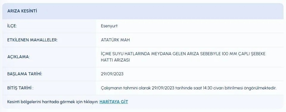 29 EYLÜL TARİHLİ SU KESİNTİSİ PROGRAMI