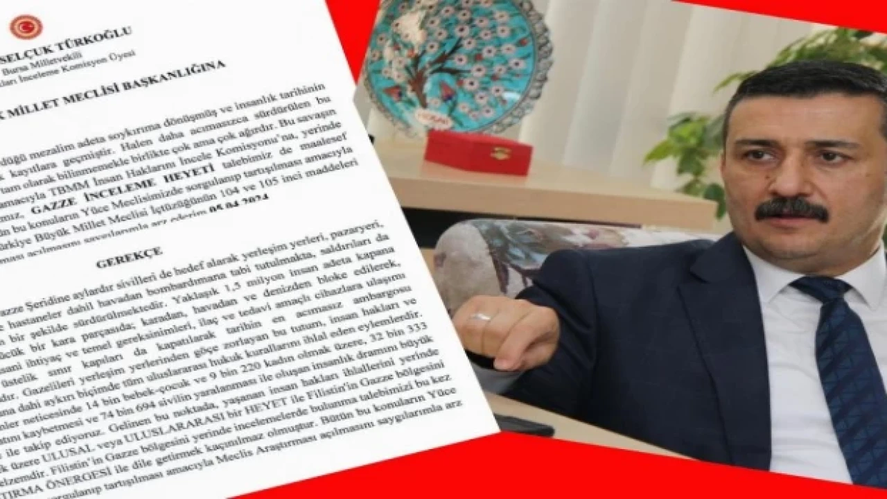 İYİ Parti Bursa Milletvekili Selçuk Türkoğlu’nun Meclis Başkanlığına verdiği Araştırma Önergesi'nde, İsrail’in Gazze’de sürdürdüğü mezalim adeta soykırıma dönüşmüş ve insanlık tarihinin utanç verici katliamları olarak kayıtlara geçtiğini söyledi.