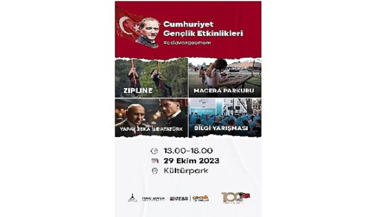 29 Ekim Pazar günü saat 13:00’te başlayacak Cumhuriyet Gençlik Etkinlikleri, Kültürpark’ta gerçekleştirilecek. Kutlamaların önemli bir ayağı olarak; yapay zekâ sayesinde Türkiye Cumhuriyetinin kurucusu Ulu Önder Mustafa Kemal Atatürk ile fotoğraf çekilmek mümkün olacak. Gençler ve çocuklar için farklı oyun alanları, zipline ile macera parkurundan farklı alanlarda atölyelere, Cumhuriyet temalı bilgi yarışmasından rengarenk boyalarla yapılacak Colour Fest’e kadar birçok etkinlik düzenlenecek. Çocuklar, ayrıca, lunaparkta da İzmir Büyükşehir Belediyesi organizasyonuyla keyifli dakikalar geçirecek. Etkinlikler, Cumhuriyetin 100. yıl kutlamalarının unutulmaz bir parçası olacak.