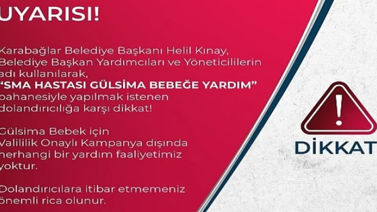 Kendilerini Karabağlar Belediyesi Başkanı Helil Kınay, belediye başkan yardımcıları, üst düzey yöneticiler ye da belediye personeli olarak olarak tanıtan bazı kişi ya da kişilerin, Karabağlar'da yaşayan SMA hastası Gülsima bebek için vatandaşlardan para istedikleri öğrenildi. Karabağlar Belediyesi’nden yapılan açıklamada, Gülsima bebek için valilik onaylı kampanya dışında herhangi bir yardım faaliyeti yürütülmediği hatırlatılarak, “Bu anlamda Karabağlar Belediyesi'nin de yürüttüğü bir yardım kampanyası bulunmamaktadır ve bunun için IBAN verilmesi kesinlikle söz konusu değildir.