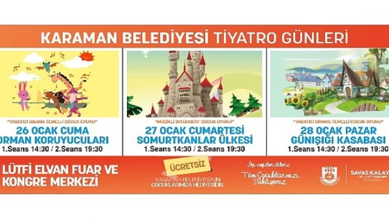 Her fırsatta çocuklar için çeşitli faaliyetler gerçekleştiren Karaman Belediyesi, yarı yıl tatilinde de öğrencileri unutmadı. Çocukların keyifle izleyeceği üç farklı oyununun sahneleneceği tiyatro etkinliği, Lütfi Elvan Fuar ve Kongre Merkezi'nde sahnelenecek. Üç gün boyunca her gün iki seans ve ücretsiz olarak düzenlenen tiyatroya tüm çocuklar ve aileleri davet edilirken, oyunlar ve seanslar şu şekilde olacak.