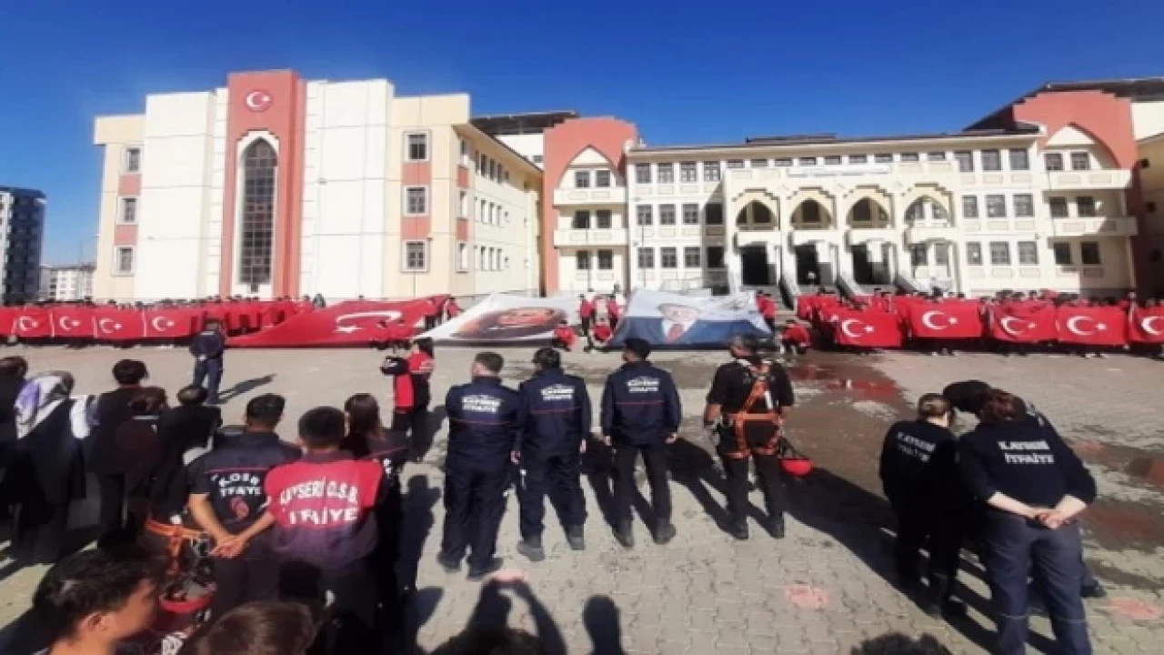 Ahi Evran Mesleki ve Teknik Anadolu Lisesi bahçesinde okul öğrencileri tarafından gerçekleştirilen tatbikat gerçeğini aratmazken, itfaiye ve öğrenciler hep birlikte Türk İtfaiyesi andını söyledi. Toplumsal bilince hizmet etmek ve kurumlar arası iş birliğini öne çıkartarak farkındalık oluşturmak adına gerçekleştirilen tatbikatta, 100 öğrenci, 100 adet Türk Bayrağı ile görsel şölen sundu.