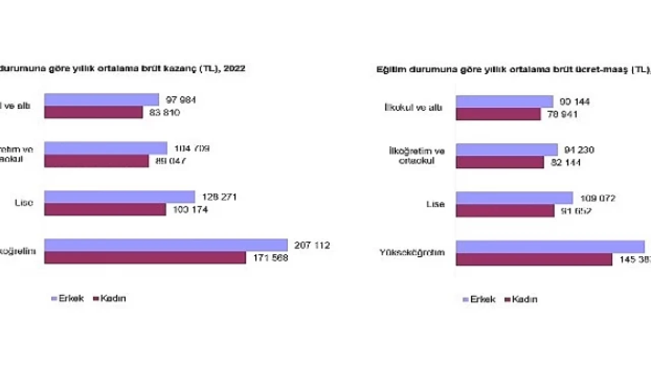 Kazanç düzeylerinin hem erkeklerde hem de kadınlarda eğitim durumu ile doğru orantılı olarak yükseldiği görüldü. Eğitim durumuna göre en yüksek yıllık ortalama brüt kazancı yükseköğretim eğitim düzeyine sahip olanlar elde etti. Bu eğitim düzeyinde yıllık ortalama brüt kazanç erkeklerde 207 bin 112 TL, kadınlarda ise 171 bin 568 TL oldu.