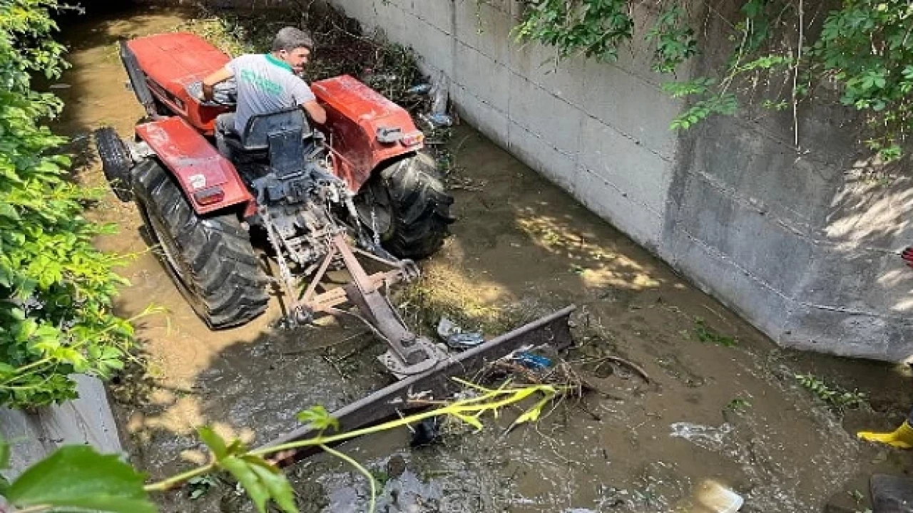 Temizlik çalışmaları kapsamında dere içindeki yosunlar, plastik atıklar ve diğer çöpleri temizleyen belediye ekipleri, ilçe genelindeki kaldırım ve yol kenarlarında büyüyen otları da tırpanladı.