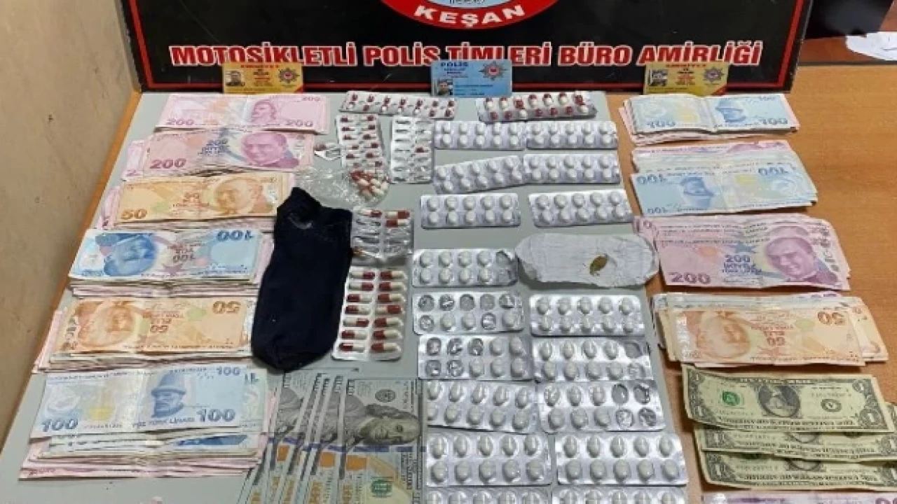 Erdoğan DEMİR / EDİRNE (İGFA) -  Durumu şüpheli görülen otomobilde yapılan aramada, Ş.A. ve Y.B. isimli şahıslara ait olduğu belirlenen; 1,17 gram esrar, 240 adet sentetik ecza, Yaklaşık 61 bin 000 TL değerinde yerli ve yabancı para ele geçirildi.