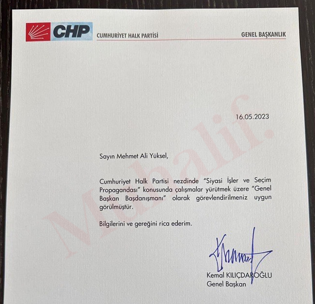 CHP Siyasi İşler ve Seçim Propagandası konusunda çalışmalarını yürütecek olan yeni Genel Başkan Başdanışmanı Mehmet Ali Yüksel'e görev bildirimini yaptı.