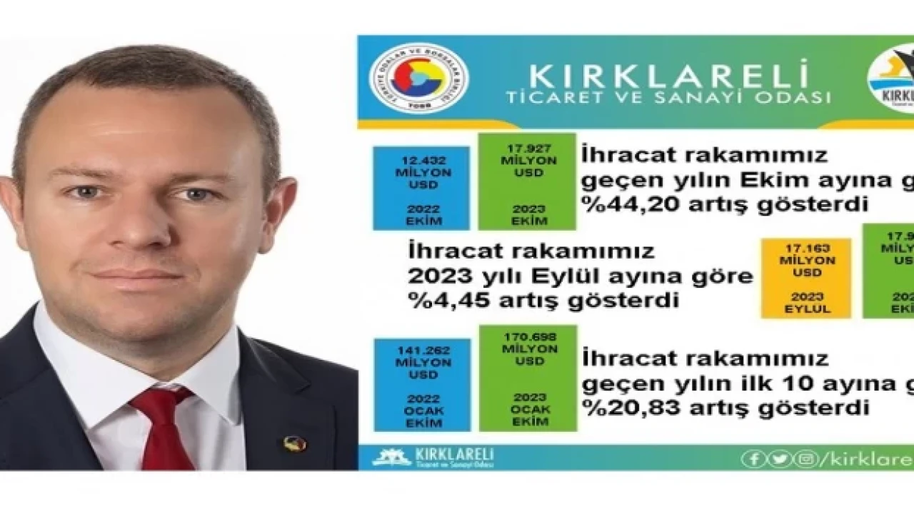 Kırklareli Ticaret ve Sanayi Odası (Kırklareli TSO) Yönetim Kurulu Başkanı Soner Ilık, Ekim ayına ilşikin yereldeki ihracat rakamlarını değerlendirdi.
