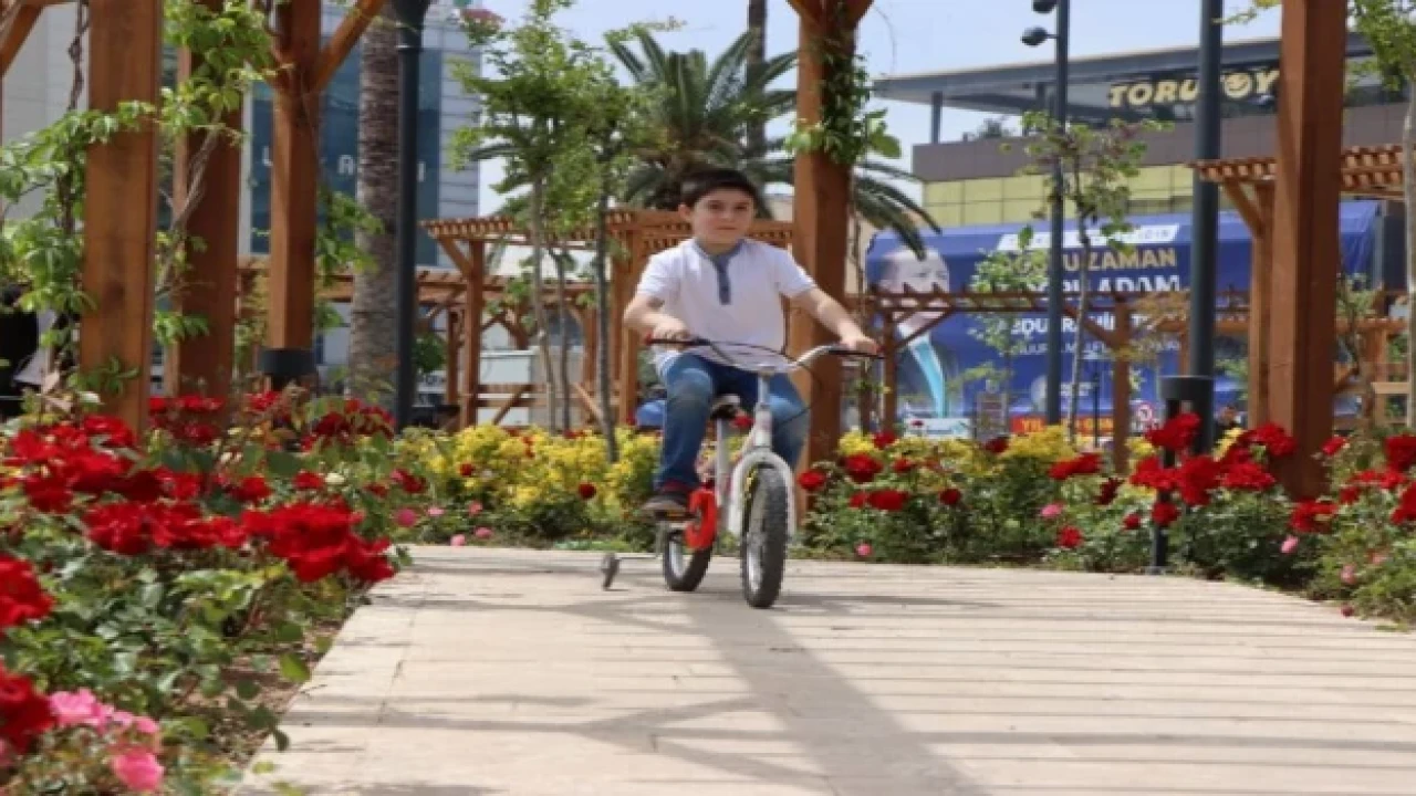 Yürüyüş alanları, aydınlatmalar, dekoratif kaldırım taşları, ağaçlandırma ve akıllı şehir mobilyalarıyla donatılan Kızılay Bahçesi Büyükşehir Belediyesi Park ve Bahçeler Daire Başkanlığı bünyesindeki seralarda üretilen gül fidelerinin toprakla buluşturulmasıyla rengârenk bir görüntü oluşturdu.