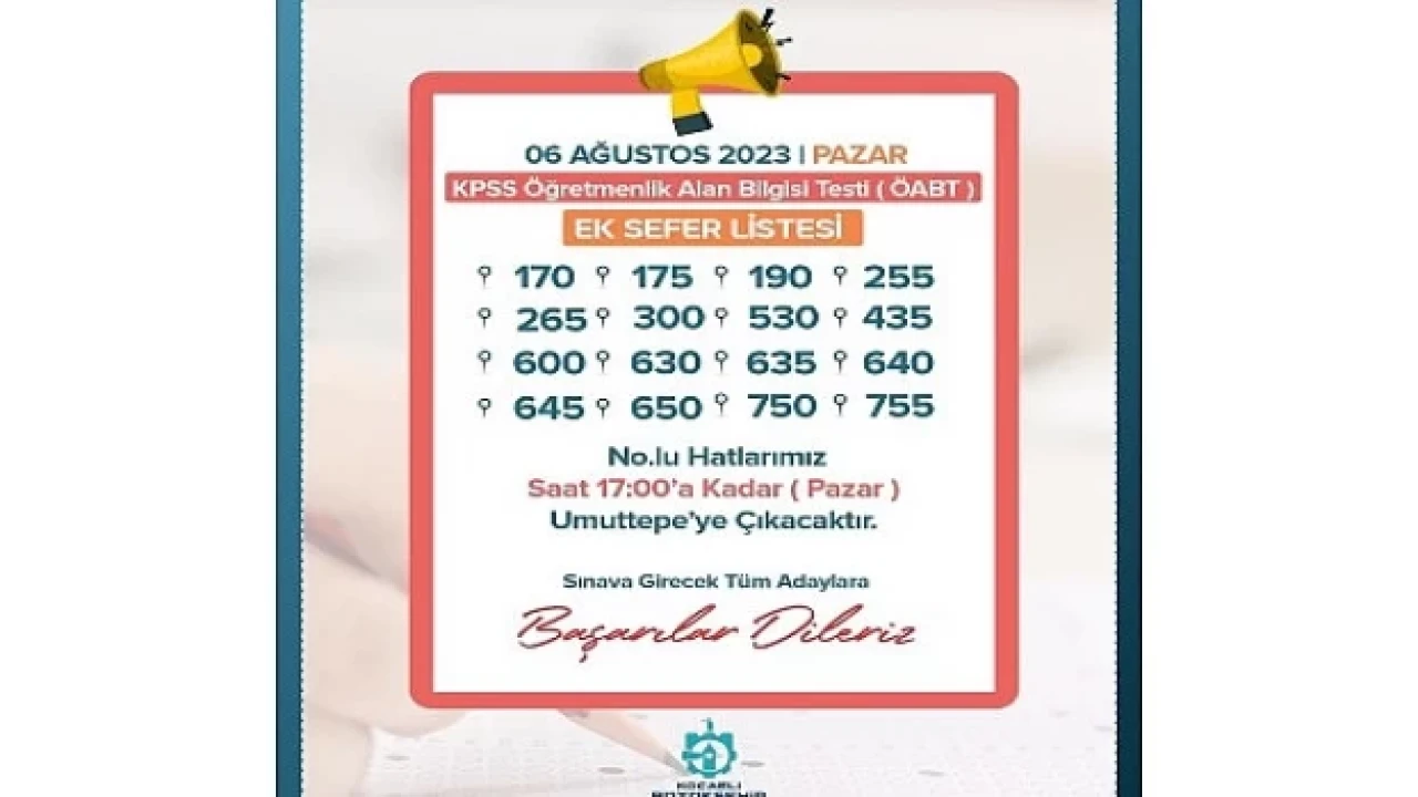 Kocaeli Büyükşehir Belediyesi, 06 Ağustos Pazar günü(yarın) yapılacak Kamu Personeli Seçme Sınavı (KPSS) Öğretmenlik Alan Bilgisi Testine girecek adayların ulaşımda sorun yaşamaması için aynı gün ek seferler düzenleyecek. Bu kapsamda 170, 175, 190, 255, 265, 300, 435, 530, 600, 630, 635, 640, 645, 650, 750 ve 755 No’lu hatlar da pazar günü ek sefer uygulanacak. Sınava girecek adayların herhangi bir olumsuzluk yaşamaması için aynı hatlar saat 17.00'ye kadar Umuttepe'ye çıkacak.