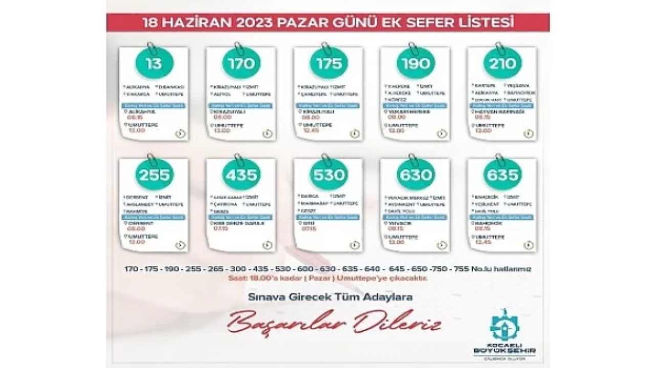 Kocaeli Büyükşehir Belediyesi, 17-18 Haziran günlerinde sınava girecek öğrenci ve sınavda görevli personel için ek sefer düzenleyecek. Ulaşımda ek seferler konularak öğrencilerin gönül rahatlığı ile sınav yerlerine gitmeleri sağlanacak.