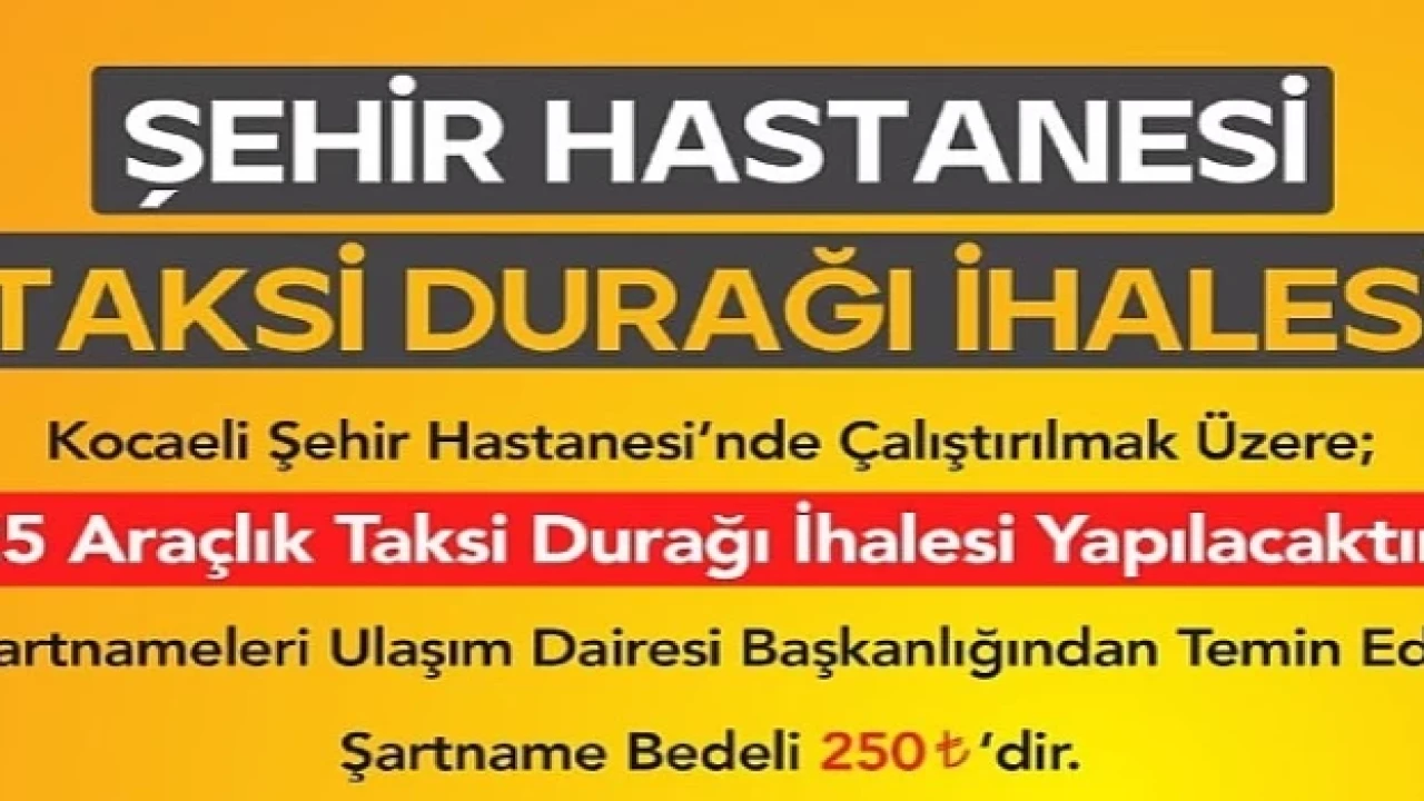 Kocaeli Büyükşehir Belediyesi, hasta kabulüne başlayan Kocaeli Şehir Hastanesi için 25 araçlık taksi durağı ihalesi düzenleyecek. İhale 17 Mayıs tarihinde Kocaeli Kongre Merkezi C Salonunda yapılacak.