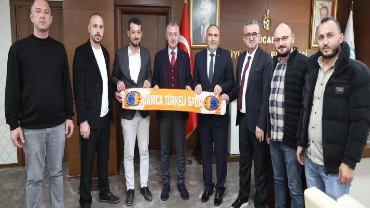 KOCAELİ (İGFA) - KOSİDEF Başkanvekili Ermiş Göksu ve yönetim kurulu üyelerinin yer aldığı ziyarette, KOSİDEF yöneticisi ve aynı zamanda Darıca’nın Süper Amatör Lig’deki temsilcisi Darıca Türkelispor’un Kulüp Başkanı Ferhat Yılmaz, Başkan Büyükakın’aTürkelispor atkısı hediye etti.