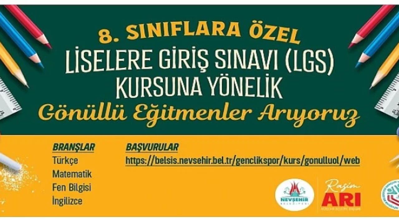 Nevşehir Belediyesi tarafından açılacak olan Liselere Giriş Sınavı (LGS) Kurslarında görev yapacak gönüllü eğitmenler için başvurular başladı.