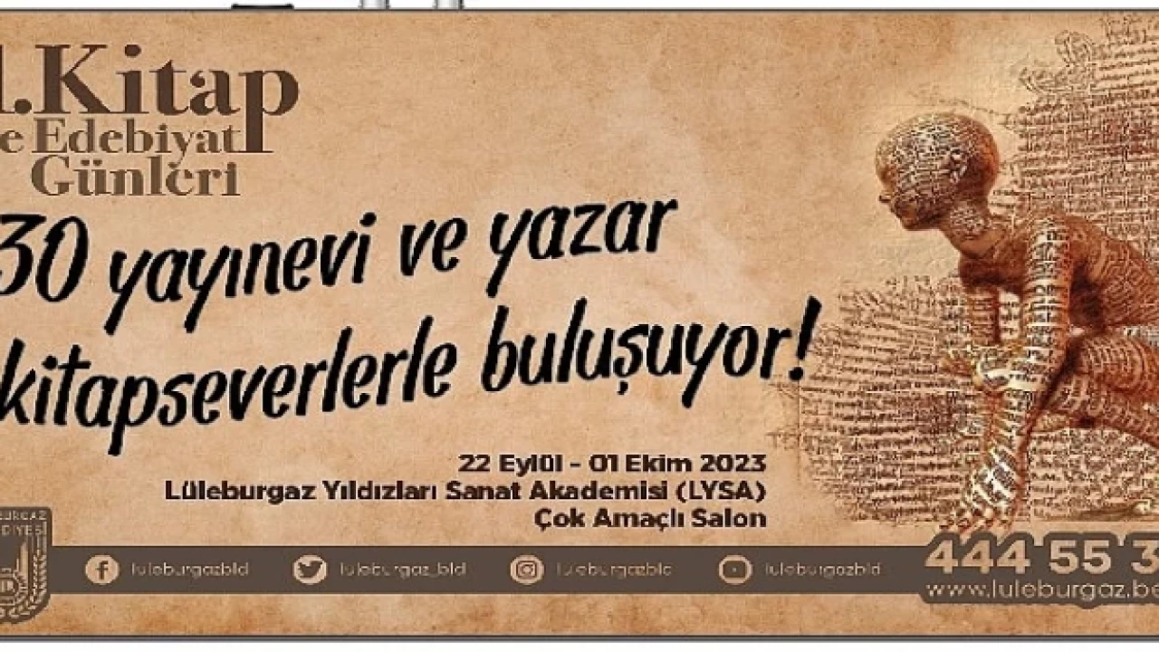 Lüleburgaz son yılların en önemli kültür-sanat etkinliklerinden birine hazırlanıyor. Lüleburgaz Belediyesi’nce 22 Eylül-1 Ekim tarihleri arasında düzenlenecek 1.Kitap ve Edebiyat Günleri’ne Onur Konuğu olarak şair ve yazar Şükrü Erbaş katılacak, Türk edebiyatının son dönemdeki en popüler ‘polisiye roman’ yazarlarından Ahmet Ümit başta olmak üzere 30 yayınevi ve yazar kitaplarını imzalayacak. 1.Kitap ve Edebiyat Günleri’nin resmi açılışı 22 Eylül’de saat 16:00’da yapılacak.