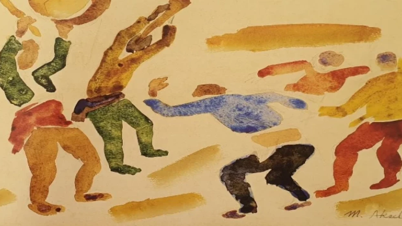 Bursa Kent Müzesi koleksiyonunda bulunan Malik Aksel imzalı tabloda suluboya tekniğinde yapılmış olan tabloda, figürler renk lekeleri şeklinde belirtilmiştir. Resmin sol tarafında elinde davul çalar vaziyette bir kişi ve onun hemen üst tarafında zurna çalan bir figür bulunuyor. Resmin sağ tarafında ise üç kişi halay çeker şekilde betimlenmiştir. Resimde mekan sarı lekelerle belirtilmiştir.