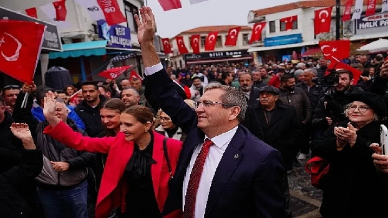 Halkla kucaklaşan CHP Ayvalık Belediye Başkanı ve CHP Belediye Başkan Adayı Mesut Ergin, sevgi dolu tezahüratlar arasında parti binası önünde kurulan kürsüden vatandaşlara seslendi.