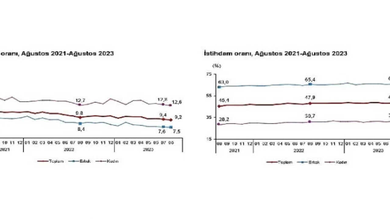 Hanehalkı İşgücü Araştırması sonuçlarına göre; 15 ve daha yukarı yaştaki kişilerde işsiz sayısı 2023 yılı Ağustos ayında bir önceki aya göre 56 bin kişi azalarak 3 milyon 223 bin kişi oldu. İşsizlik oranı ise 0,2 puan azalarak %9,2 seviyesinde gerçekleşti. İşsizlik oranı erkeklerde %7,5 iken kadınlarda %12,6 olarak tahmin edildi.