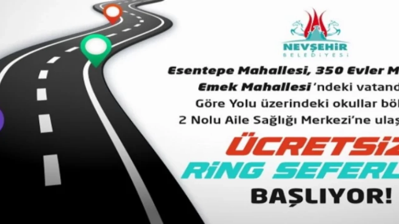 Nevşehir Belediyesi tarafından, Esentepe Mahallesi, 350 Evler Mahallesi ve Emek Mahallesi’ndeki vatandaşların Göre Yolu üzerindeki okullar bölgesi ve 2 Nolu Aile Sağlığı Merkezi’ne ulaşımları için ücretsiz ring seferleri başlatıyor.