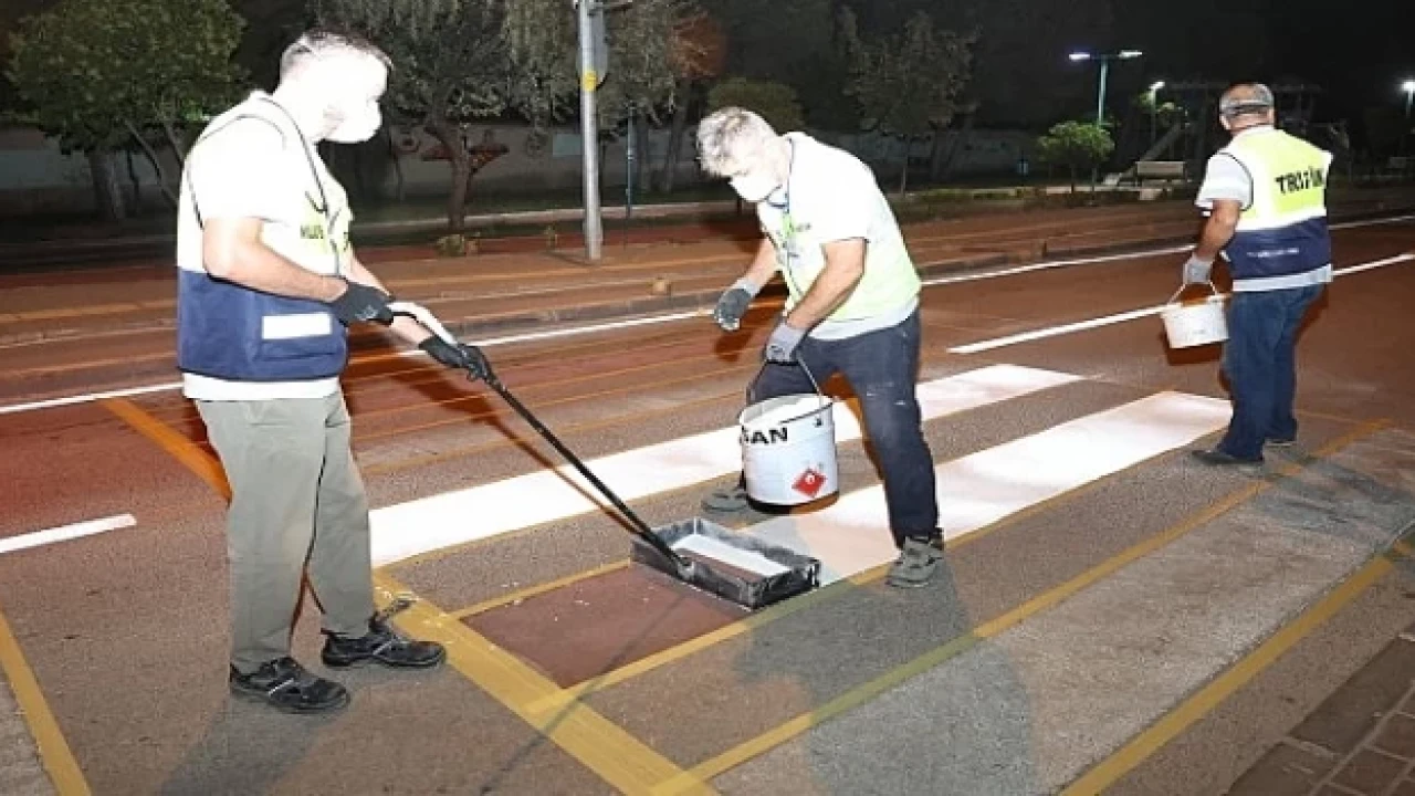 Nilüfer Belediyesi ekipleri, yaya ve araçların güvenliği için kasis, yaya geçidi ve yol şerit çizgilerini gece mesaisi yaparak yeniliyor.